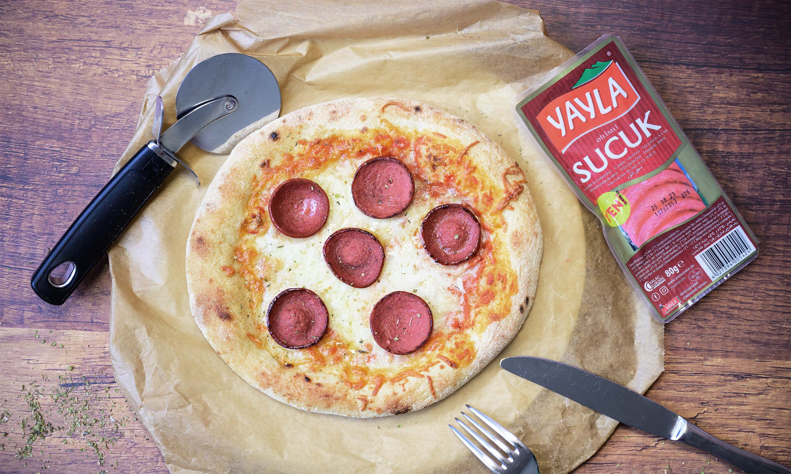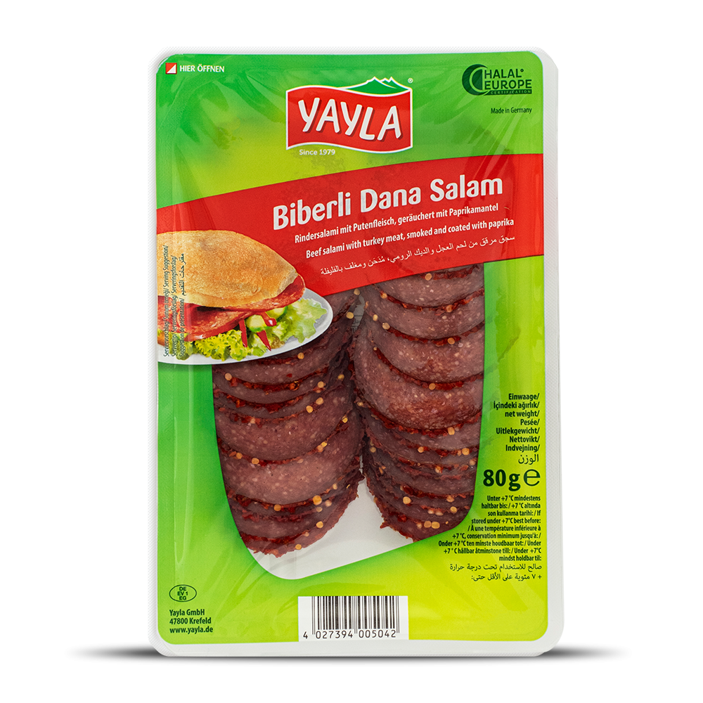 100g of beef salami made from 55g beef, 44g turkey meat and 16g beef fat.Ingredients:beef, turkey meat, beef fat, iodized table salt (table salt, potassium iodate), spices (contains mustard), spice extracts, Maltodextrin, food extract with coloring properties: red beet powder; antioxidant: E300, E301; preservative: E250; ripening cultures, beech wood smoke. Surface treated with preservative: E202. Can