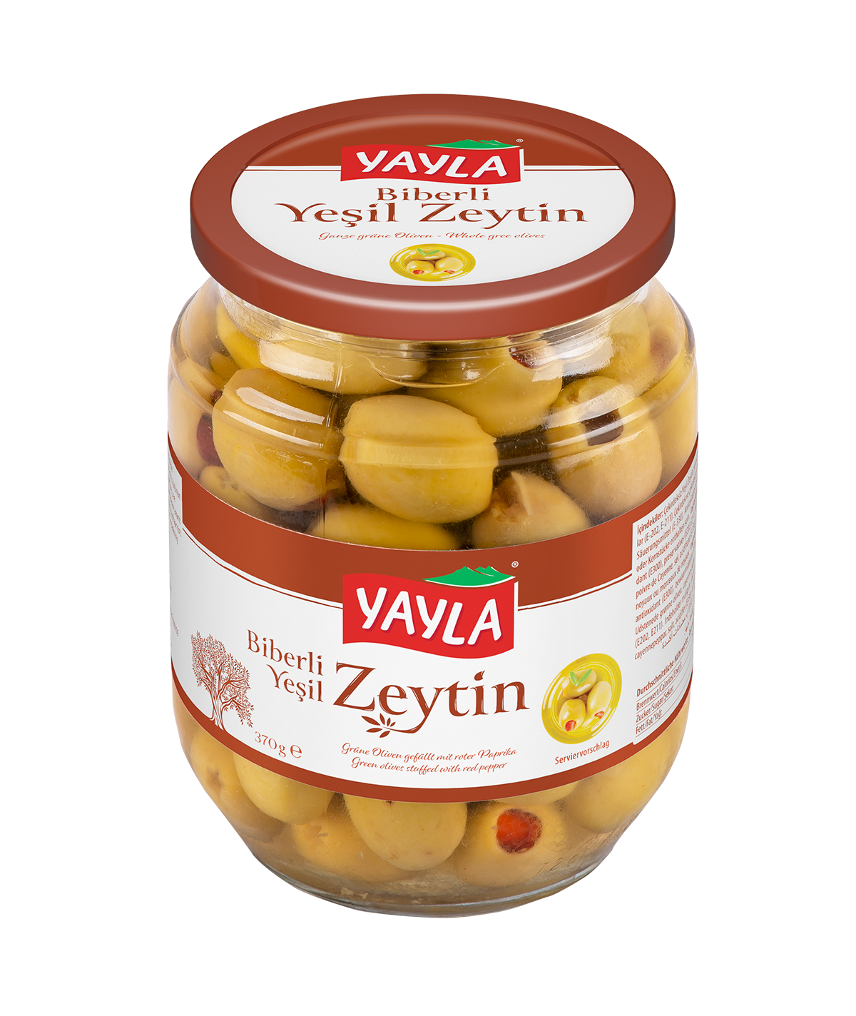 Pitted green olives (90%), sunflower oil, salt, red chilli powder, thyme, acidity regulator (E330), preservatives (E211, E202).